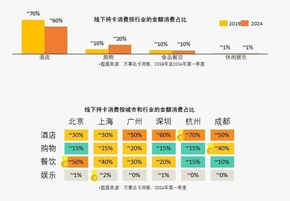 机票和酒店的预订周期相比疫情前显著缩短,如短途和长途旅行提前30天及以上订票的用户比例平均下降了7%以上;卡均机票和酒店消费显著增高,分别增加50%及14%。游客更看重旅游品质及体验,在住宿方面更倾向选择高品质的星级酒店,2023年约73%的游客选择四星及以上酒店,略高于2019年;出境旅游消费中购物类开支占比由58%下降至50%,而餐饮类消费占比由18%上升至28%。