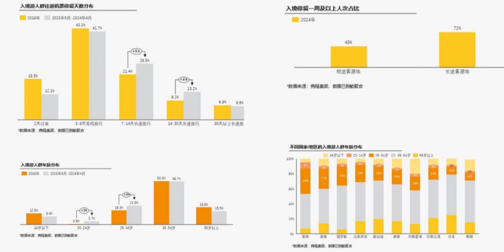2023年和2024年,在华停留一周以上的游客占比同比2019年显著增加,且无论是亚洲短途客源地还是欧美、大洋洲等远途客源地均有此特征。近一半的入境游客仍为35-54岁的中年客群,但值得注意的是,入境游客年轻化特征显著,20-35岁的年轻客群占比同比2019年提升9%。