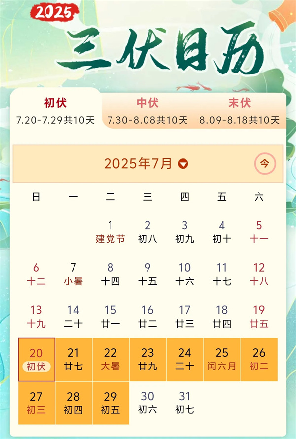 当夏至与立秋之间出现四个庚日时中伏为10天,出现五个庚日则为20天。初伏为10天,中伏为10天或20天,末伏为10天。